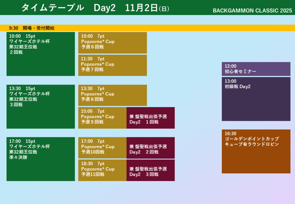 タイムテーブル / TIMETABLE ※王位戦1回戦の開始時刻はDay1・17:00となりました※盤聖戦出張予選Day3の開始時刻を11:30に変更しました※協賛品争奪トーナメントの開始時刻をDay3・13:00に変更しました Facebook Twitter